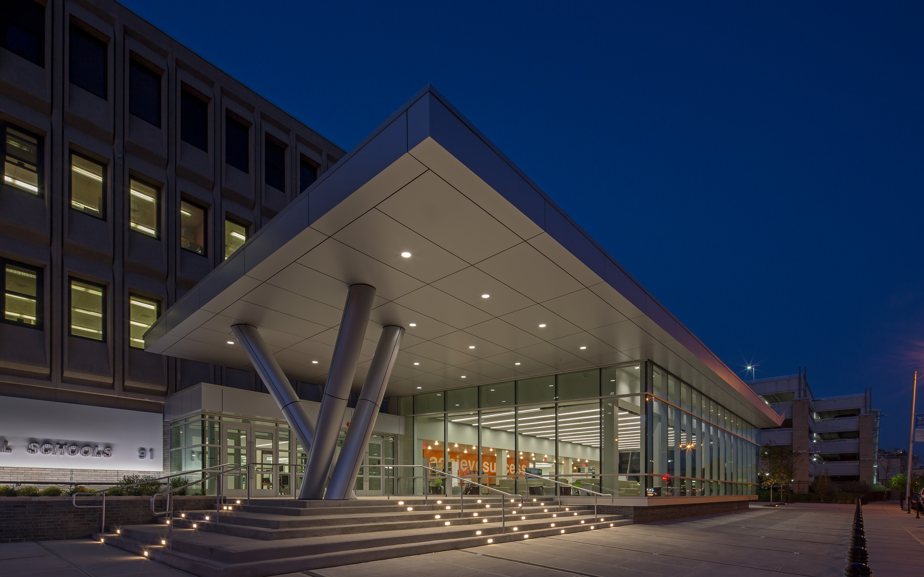 The Newark technical high school’s new building is labeled a Technology Enhanced Accelerated Learning Center (TEAL) as its reward program for committed students and also as a showcase entry feature. The high tech space is designed as a working lab where adaptability and flexibility become the program work zones that range from collaboration areas to independent self-directed study cubes to a ‘think tank’ stadium type seating organization. All are established and transformed by furniture and objects in an open space. Opening its wall up to the morning sun and keeping a window on the world, the design an identifiable brand now for the school and the downtown neighborhood.